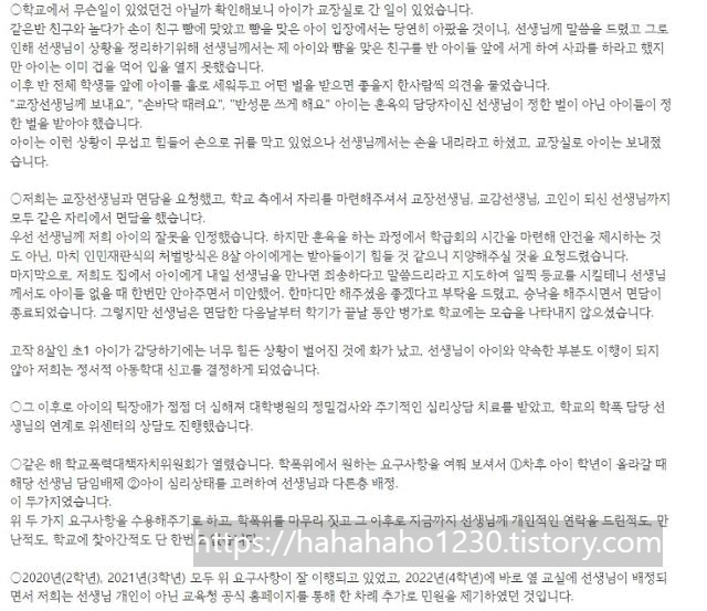 지난번 포스팅한 대전교사 자살 사건이 점점 새로운 이야기들을 맞이하면서 여러 가지 양상을 보이고 있습니다. 가해자로 지목된 학부모들의 입장문 발표와, 이에 따른 동료교사의 반박 입장발표, 그리고 같은 반 학부모였던 분의 입장발표 등으로 계속해서 새로운 의견이 나오고 있습니다. 자세히 알아보도록 하겠습니다.