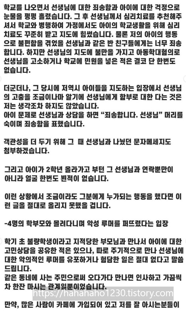 지난 7일 고인이 자살시도 이틀만에 돌아가신 후, 대전교사의 사망 원인에 몇 년 전 담임이었던 반의 4명의 학부모들이 지속해서 악성민원이 있었다는 게 알려졌습니다. 그 뒤로 4명의 학부모들의 신상이 여러 SNS 등이 밝혀지면서 대전의 한 미용실, 김밥집, 체육관 관장이라는 사실까지 알려졌습니다. 그러면서 여러 분노한 시민들의 별점테러나, 영업장에 메모지를 붙이는 등 정상적인 영업이 어려워졌습니다. 그러한 가운데 미용실과, 체육관 관장으로 있던 두 학부모가 입장문을 발표했습니다.